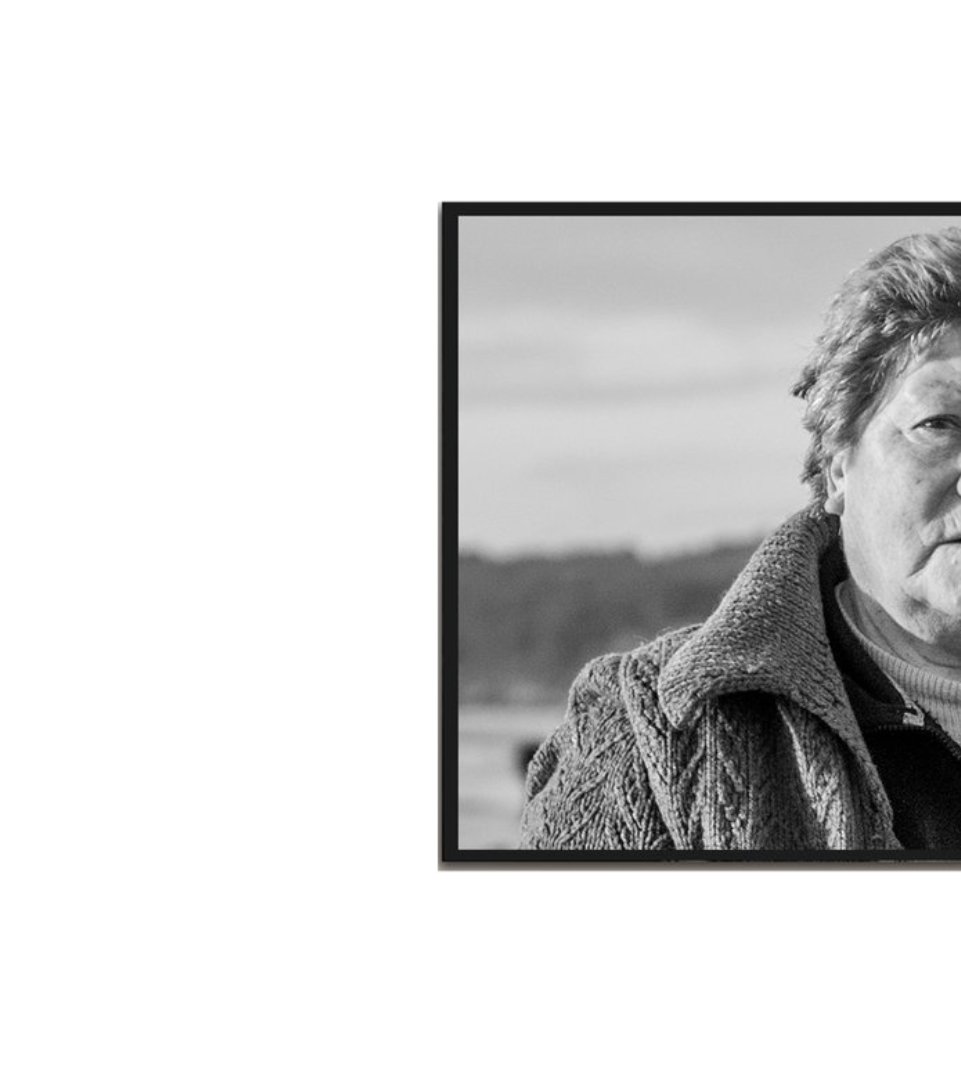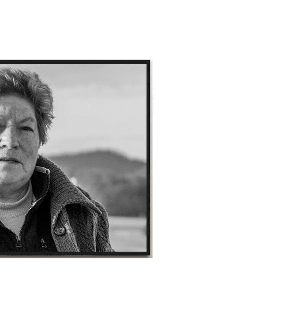 El panel cerrado presenta el retrato sin texto ni contexto, invitando al espectador a detenerse y preguntarse quién es y cuál es su historia.