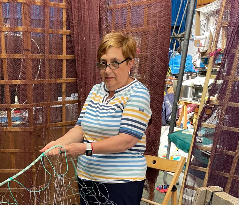 Alrededor de los 30 años pudo formarse como redera. Se apuntó a un curso y ya no dejó nunca ese trabajo. Lleva más de tres décadas cosiendo y reparando redes, un oficio completamente manual que no puede mecanizarse. Las redes de cerco pueden medir hasta 600 metros y pesar más de mil kilos; las de bajura se trabajan nudo a nudo, en jornadas largas, bajo el frío o el calor.
